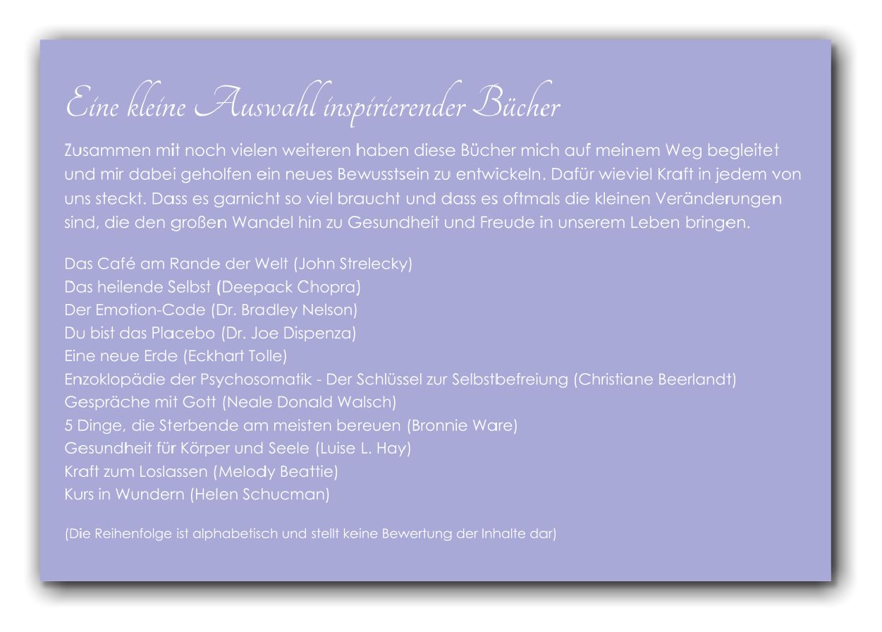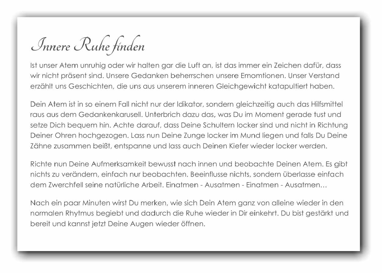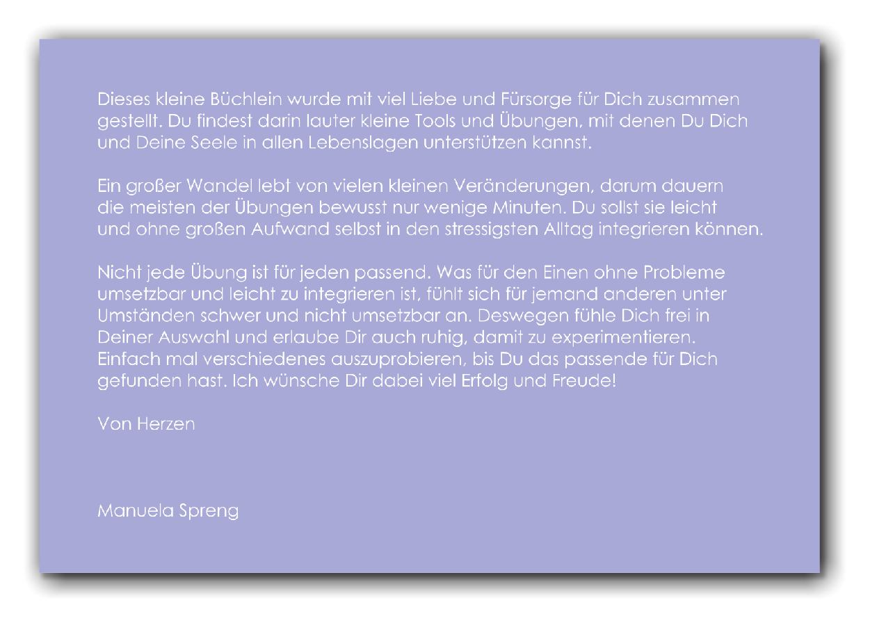 Es enthält lauter kleine Tools und Übungen, die bewusst nur wenige Minuten Zeit in Anspruch nehmen. Sie eignen sich genau deswegen dazu, sich und seine Seele auch in einem vollgepackten Alltag in allen Lebenslagen unterstützen zu können.
