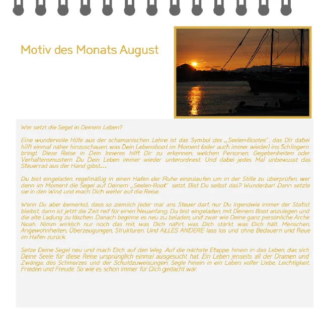Der „Motiv des Monats-Mini“ ist wie eine Cabrio-Fahrt durch das Jahr, während der Du Dir immer die aktuellen Monatsenergien um die Nase wehen lassen kannst. In manchen Momenten magst Du vielleicht ganz in das jeweilige Bild eintauchen, in anderen Dich dagegen von den Texten daran erinnern lassen, welch wundervolle Lehrmeisterin wir zu jeder Zeit und in allem um uns herum für uns finden, wenn wir die Augen dafür offenhalten.